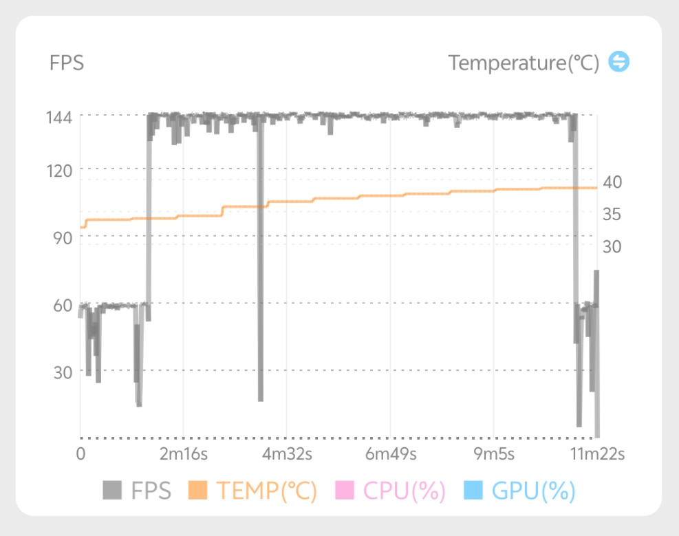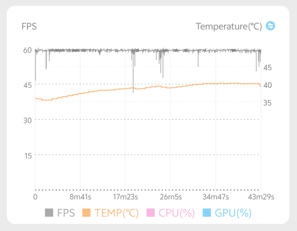 手机最高温度在40℃左右,这三款游戏最高温度几乎都在40℃上下,散热很给力。