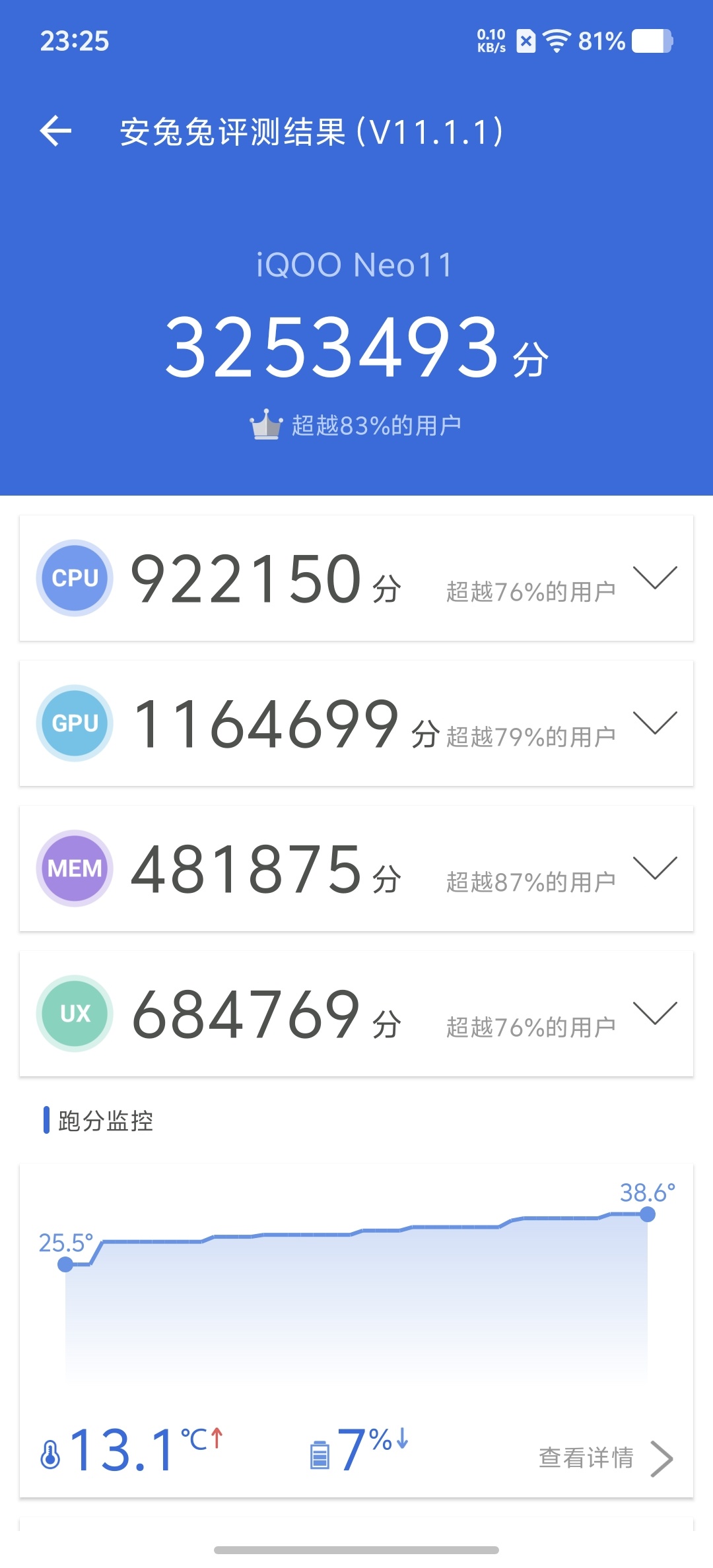 先用安兔兔跑个分,室温20℃左右,手机无任何辅助散热,跑分在325w左右,性能非常强;