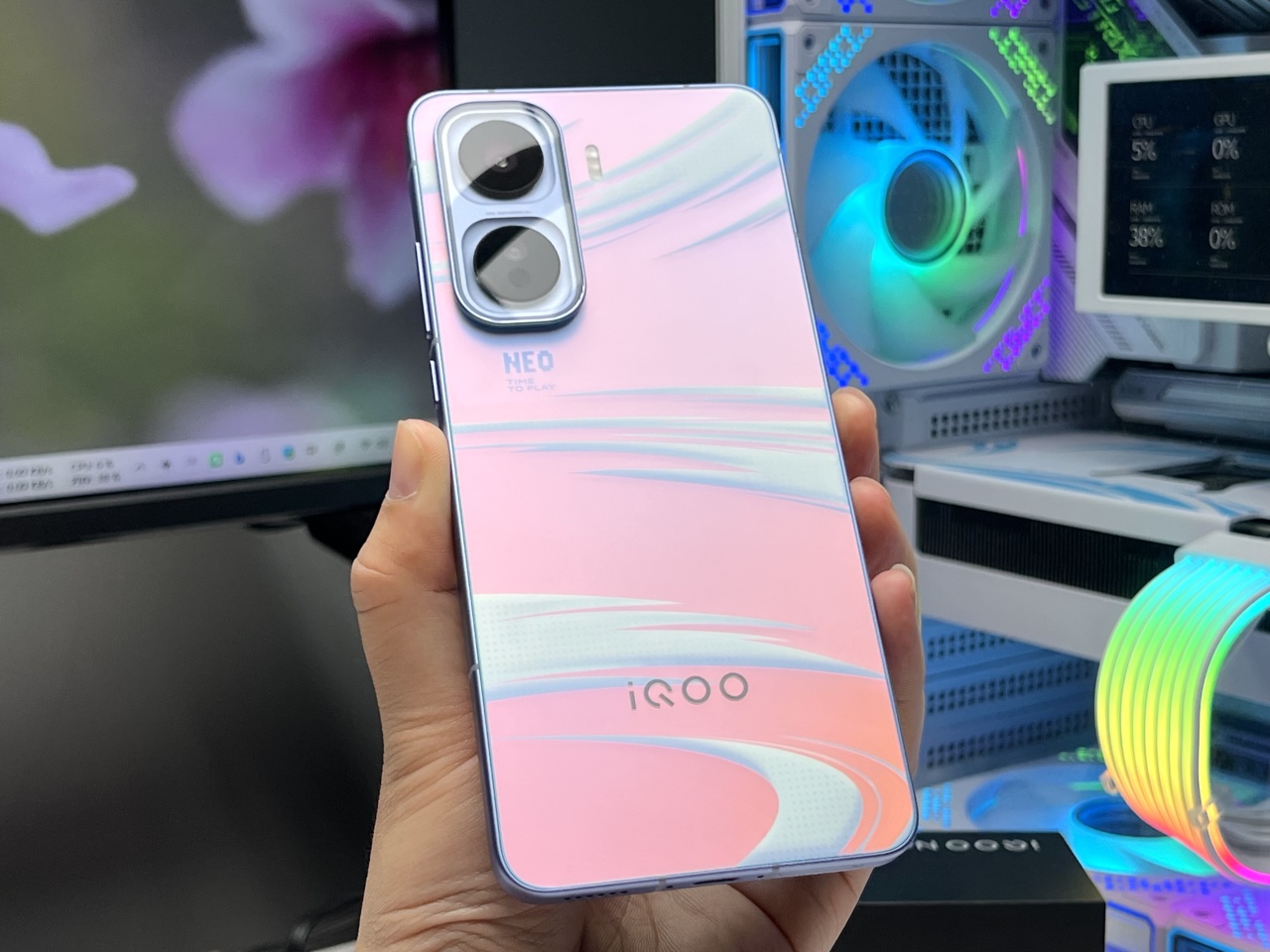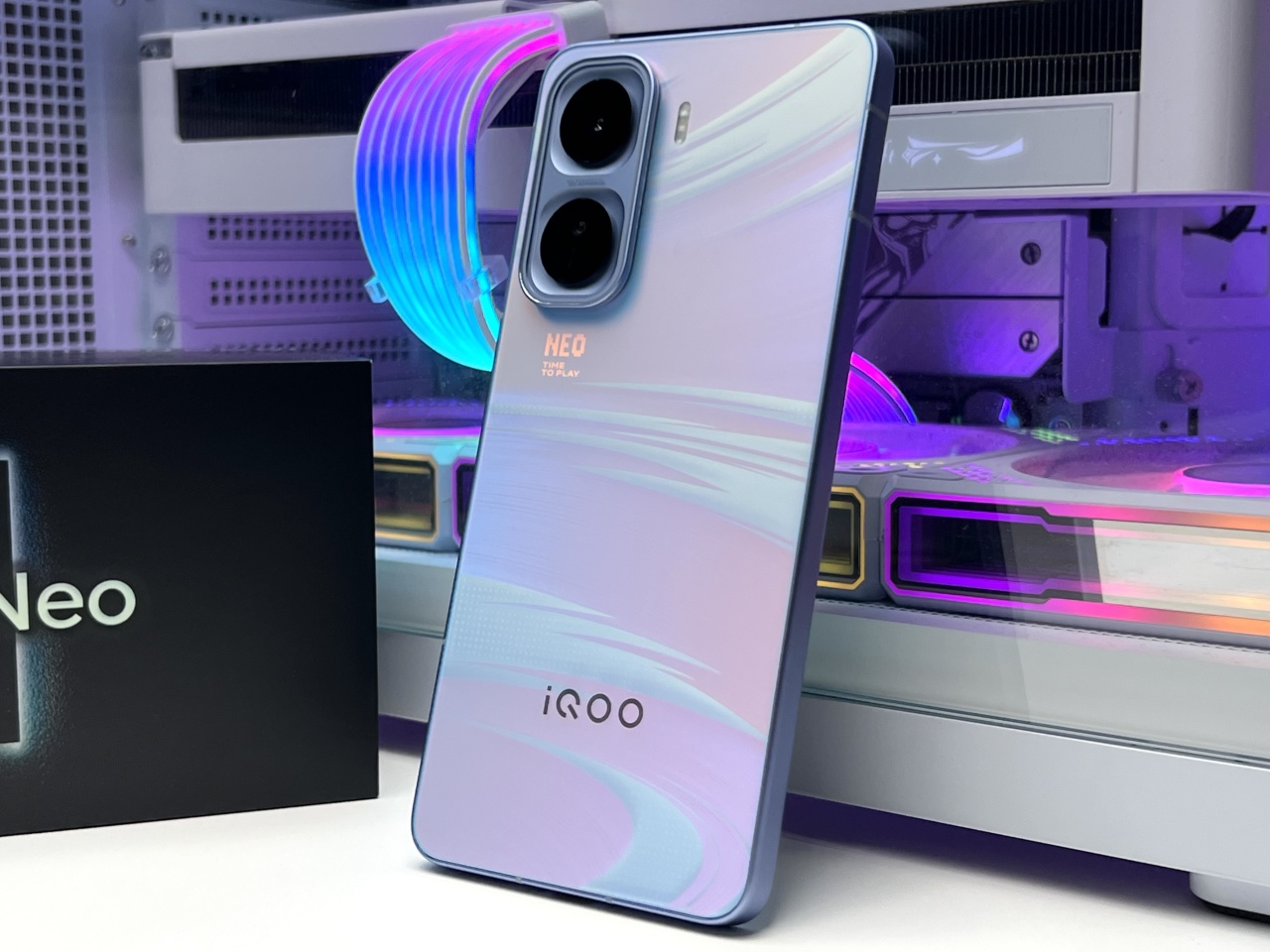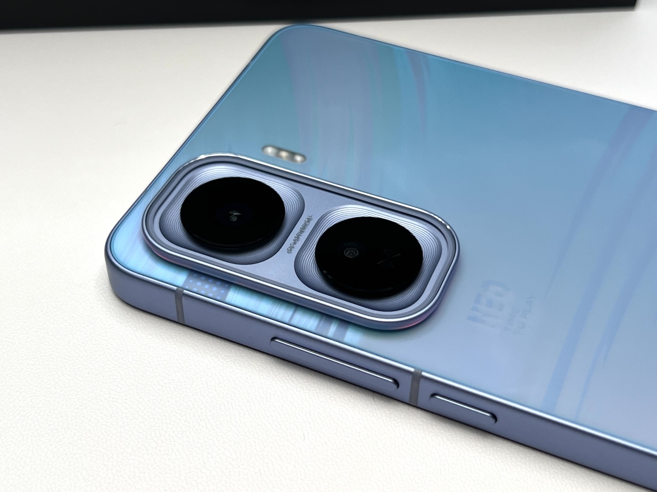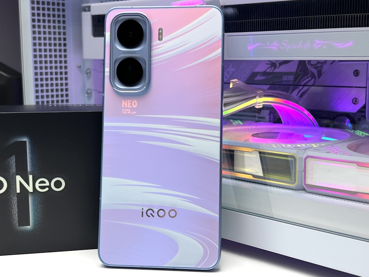 后盖的颜色也很好看,主基调是冰蓝色,官方说用了行业独家的霓虹工艺+芯片级光刻,让Neo 11冰蓝色后盖在不同角度和光线下呈现出一种流转蓝、粉、紫、橙的渐变;后盖除渐变外还有三处旋风纹理,呼应“面对疾风”SKU主题。