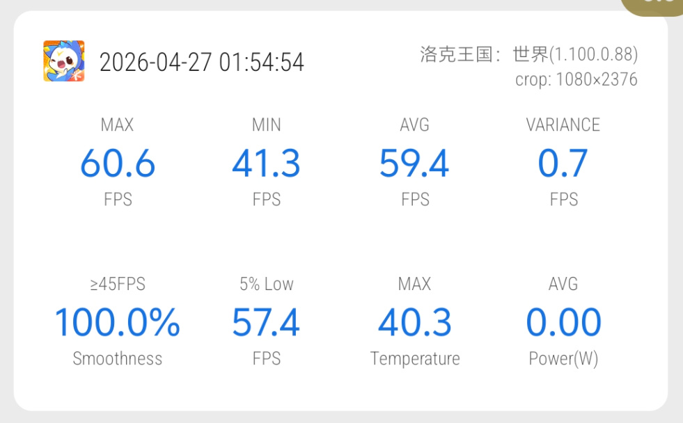 游戏最高帧率60.6FPS,59.4的平均帧几乎和峰值帧率差不多,很强!