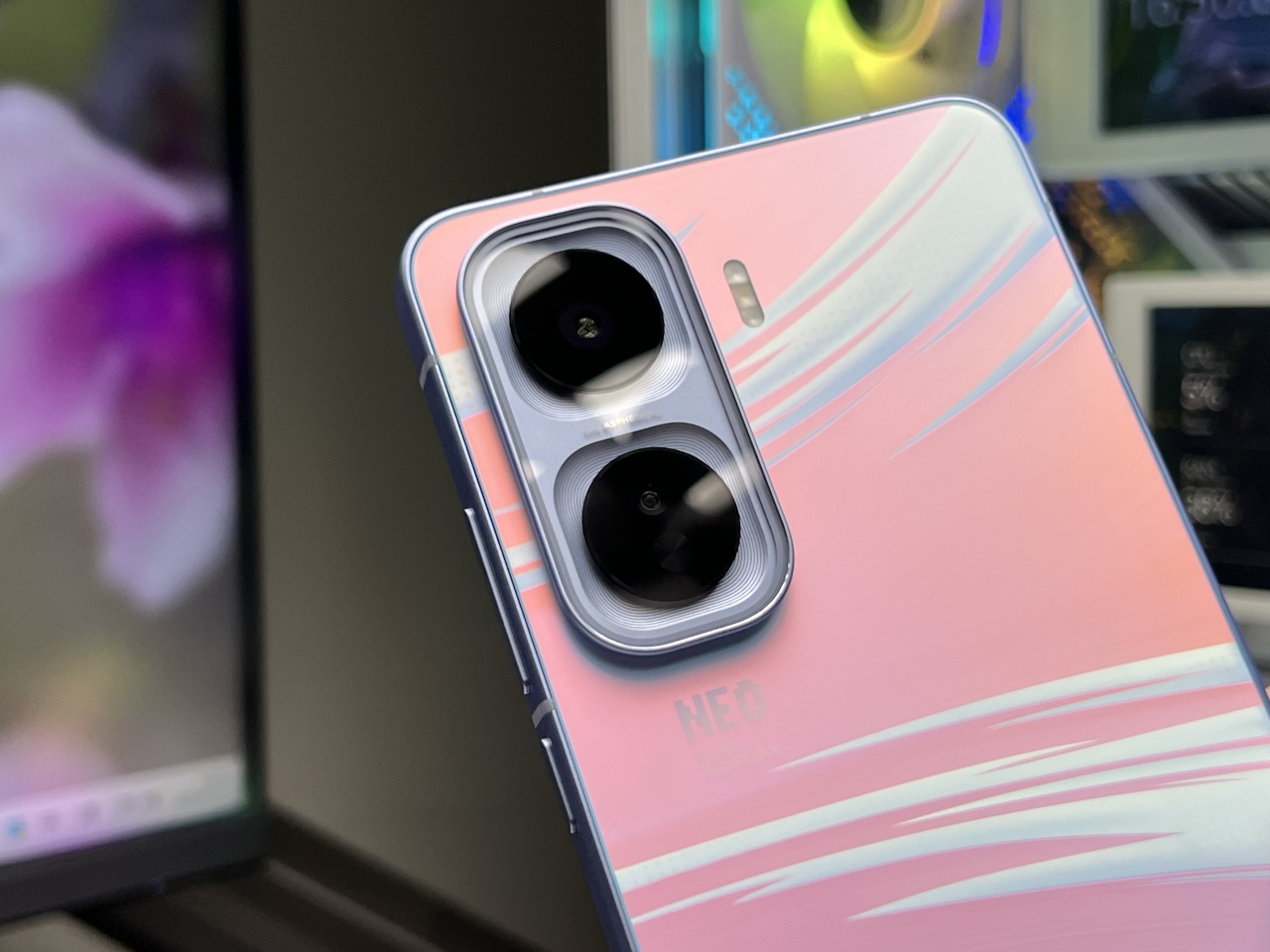 镜头模组官方称用的是悬浮之境设计,主摄和广角非常大,下方做了一圈又一圈的铝合金漩涡纹理,我个人觉得更像目前比较火的“深渊镜”;下方是像素风的Neo11型号。