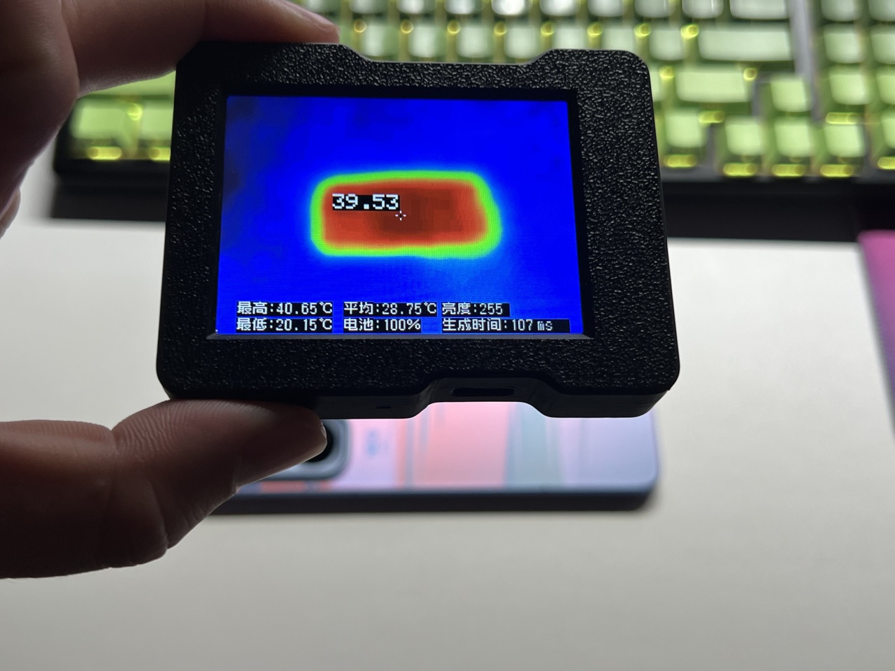 测试期间安兔兔显示手机温度上升了13℃,拿自己手搓的红外测温简单测了下,后盖温度在40℃出头,微热,不至于烫手,这里主要归功于手机玻璃后盖贴了大面积VC+多层石墨导热,也就是官方宣传的“8K冰穹VC液冷”。