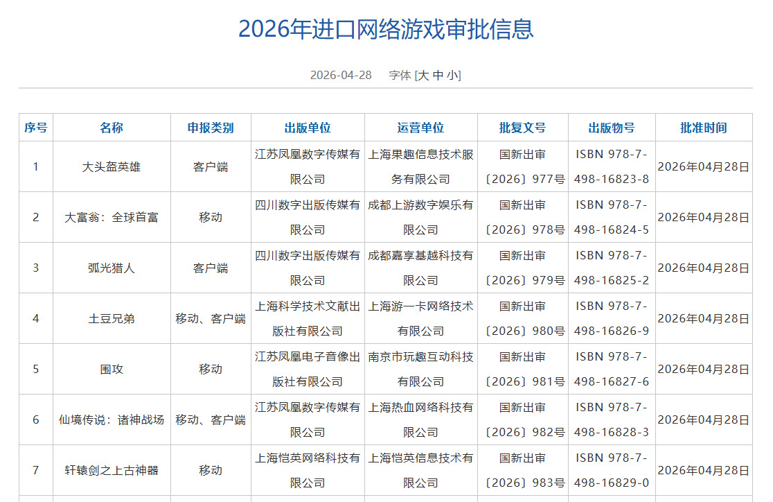 《土豆兄弟》《弧光猎人》(ARC Raiders)等7款进口网络游戏过审。