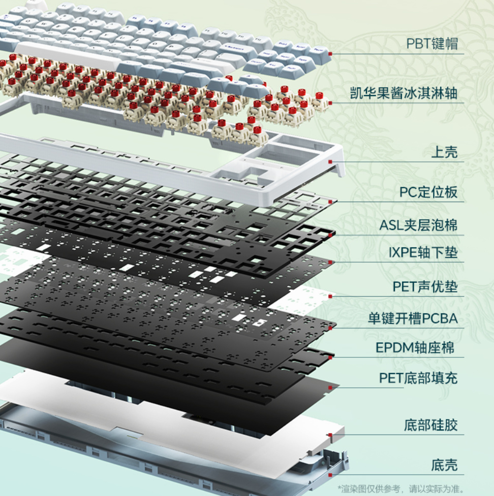 填充方面有六层,跟之前的青龙保持一致,ASL夹层泡棉、IXPE轴下垫、PET声优垫、EPDM轴座棉、PET底部填充,再加上底部硅胶。