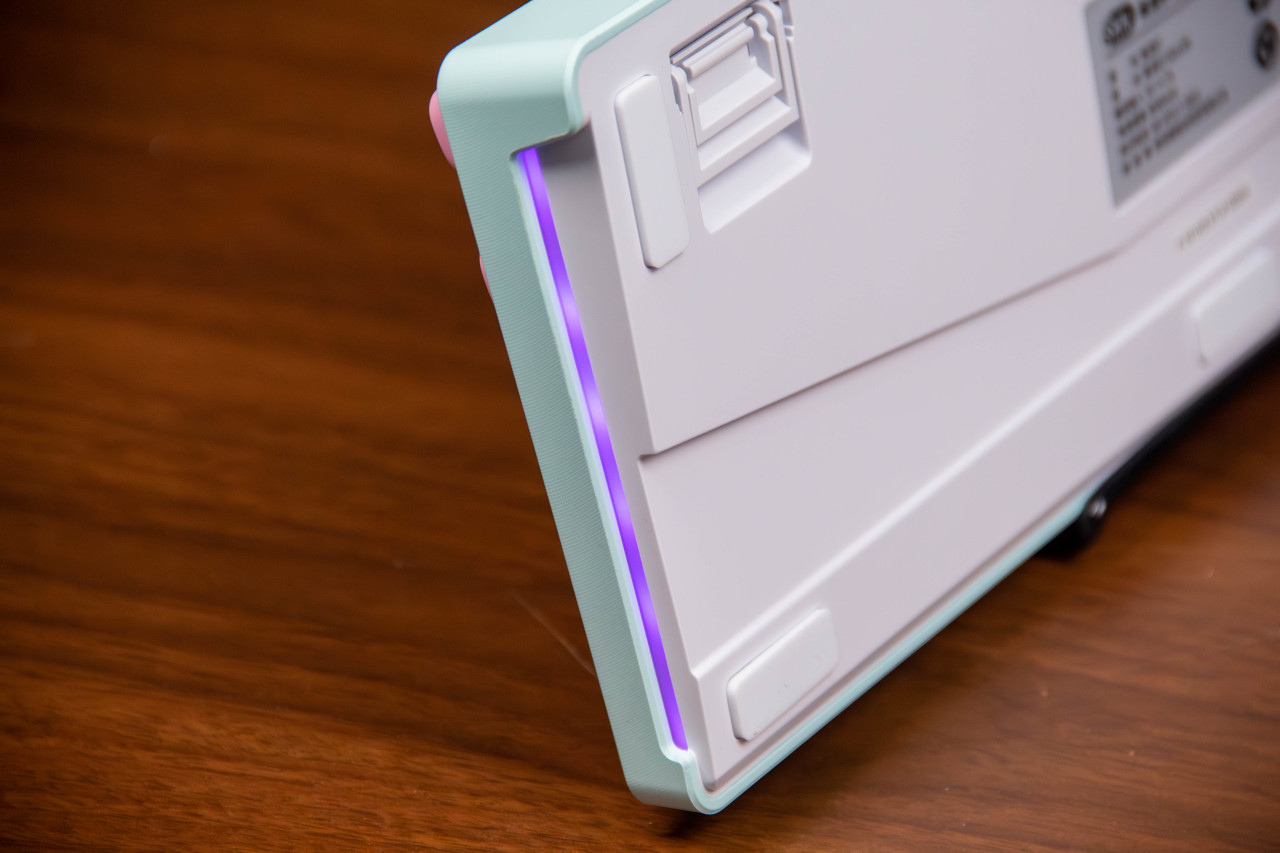 两边还有RGB氛围灯,做了均光设计但没做完全,仍然能看到灯珠效果。但它只是个氛围灯,光线反射在桌面上,也无可厚非,有总比没有强。