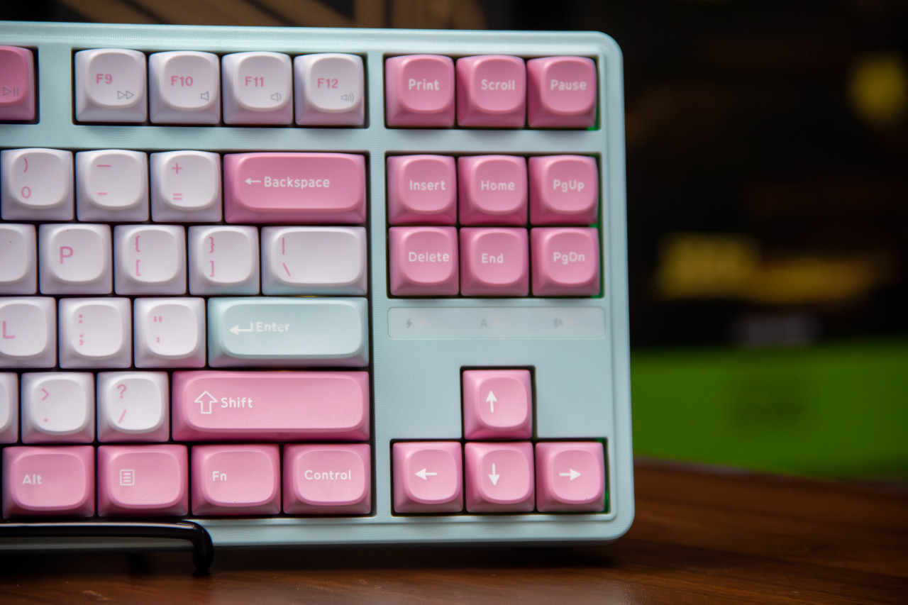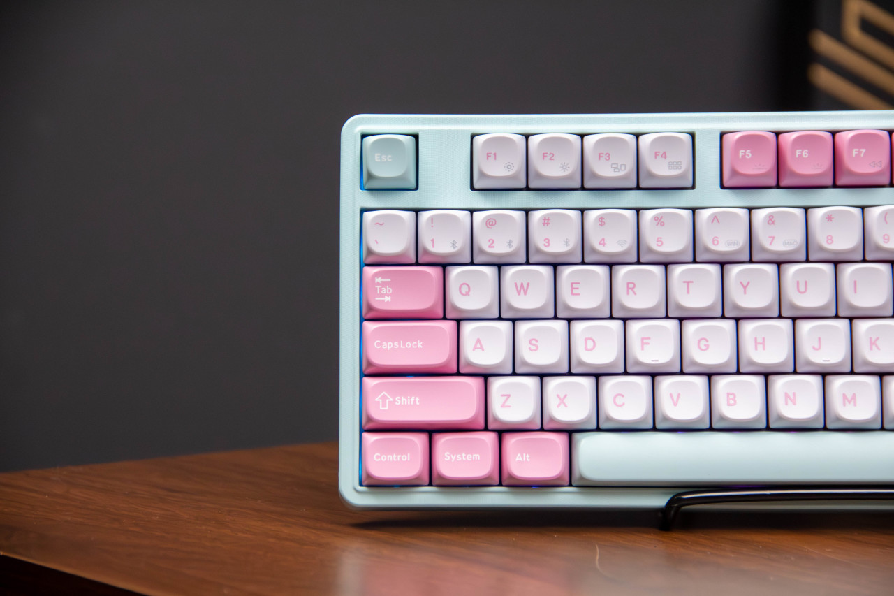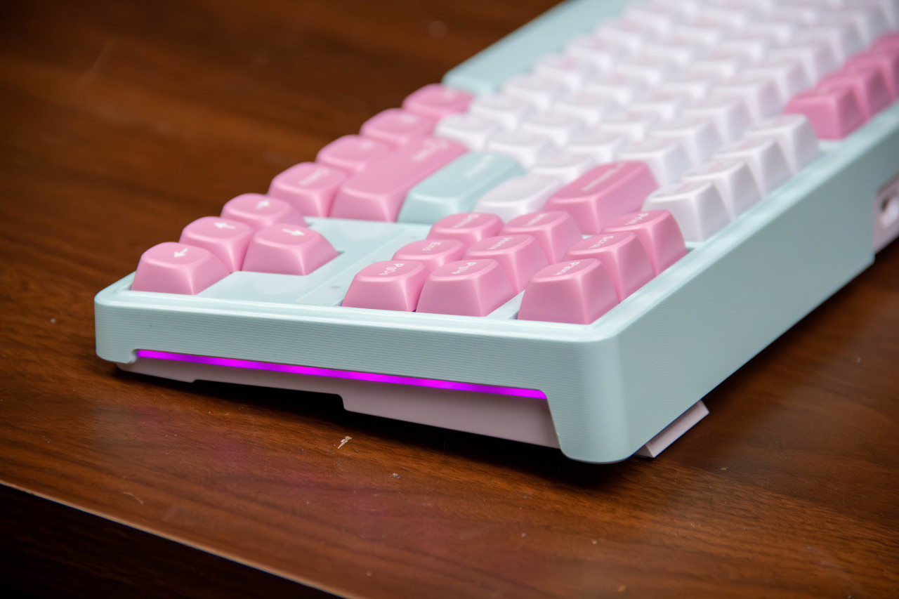 尤其是我手里这把“韶”,我每次都会选这个颜色。粉红色的大键位,加上白色字母区,还有粉色字母点缀,以及ESC、空格、回车的颜色跟壳体一样是青色,整体搭配非常少女心。