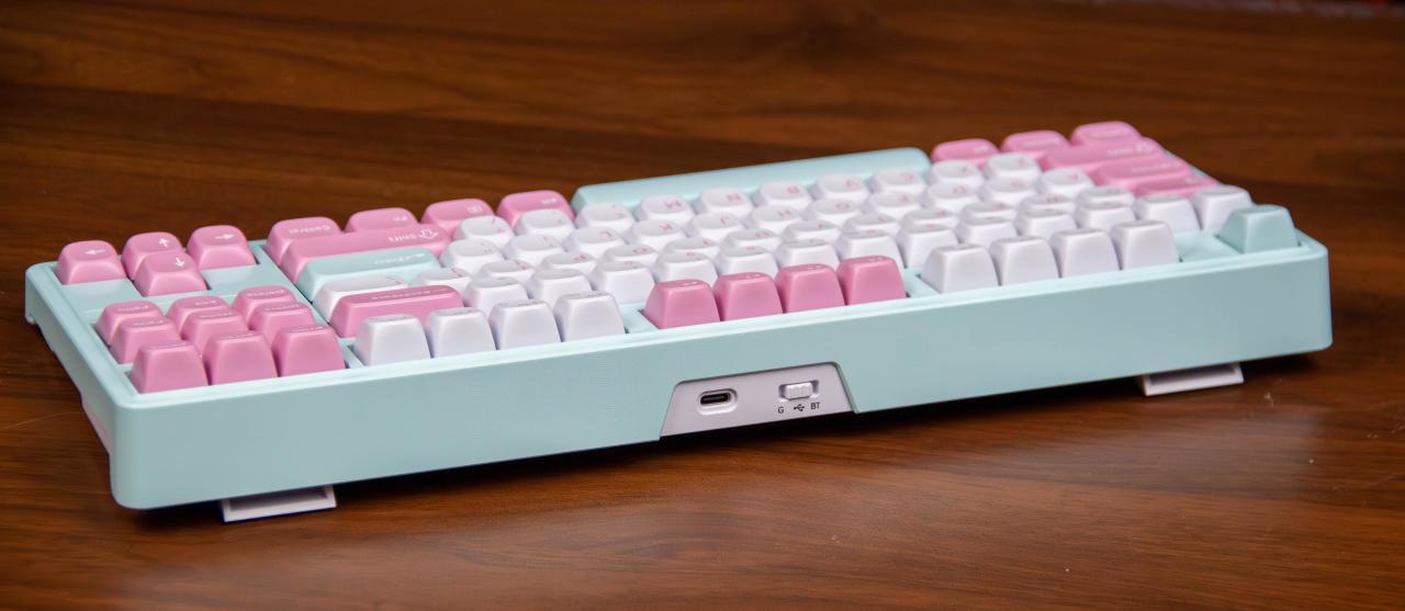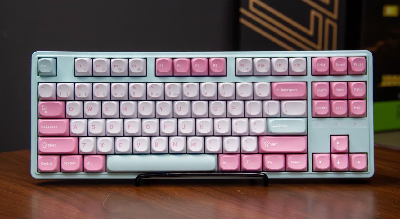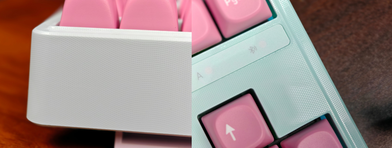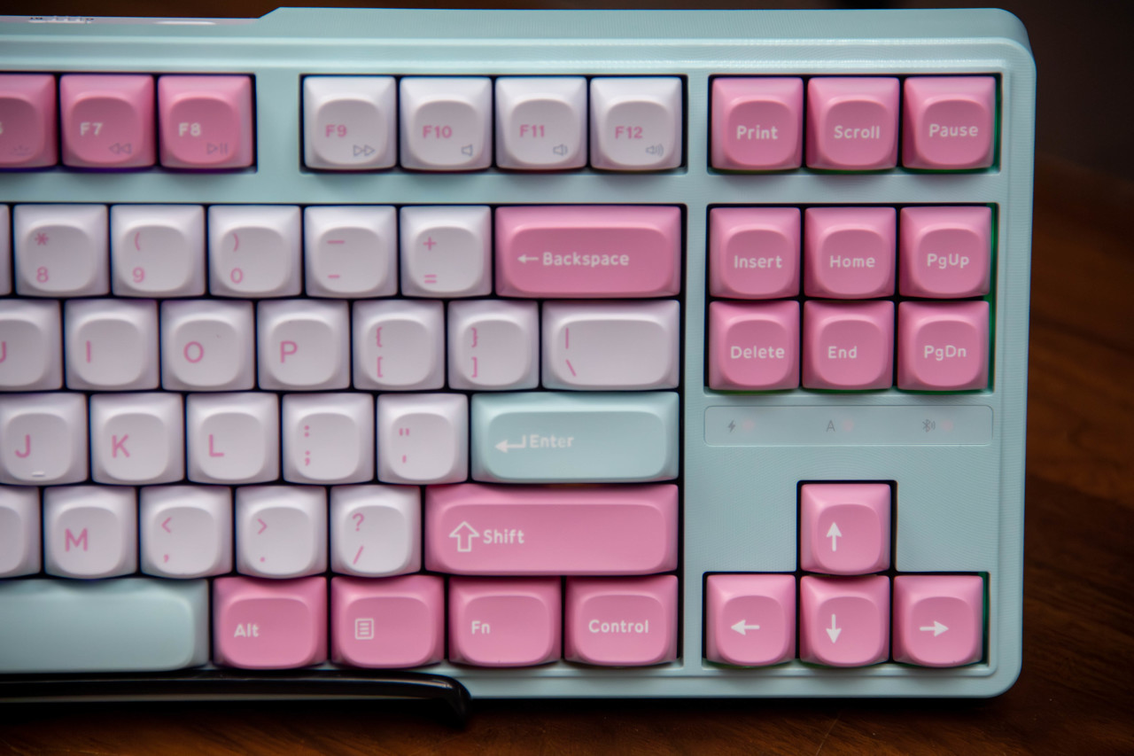 尤其是我手里这把“韶”,我每次都会选这个颜色。粉红色的大键位,加上白色字母区,还有粉色字母点缀,以及ESC、空格、回车的颜色跟壳体一样是青色,整体搭配非常少女心。