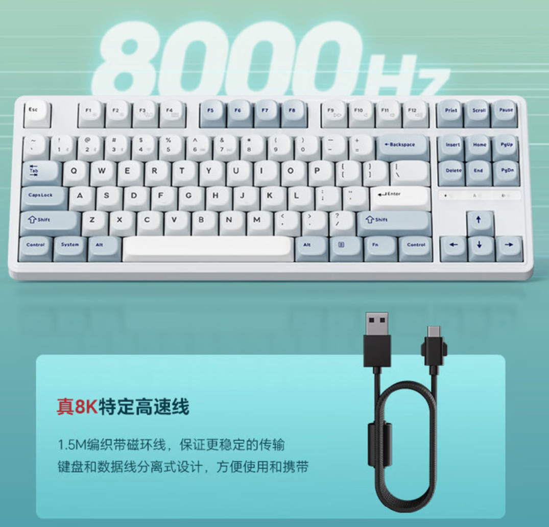 性能方面,Ultra版本支持有线+2.4G双8K回报率,延迟可以干到0.125ms。有线用的是8K特定高速线材(1.5米编织线),带磁环抗干扰,够用了,不需要额外换线,除非你换发光线。