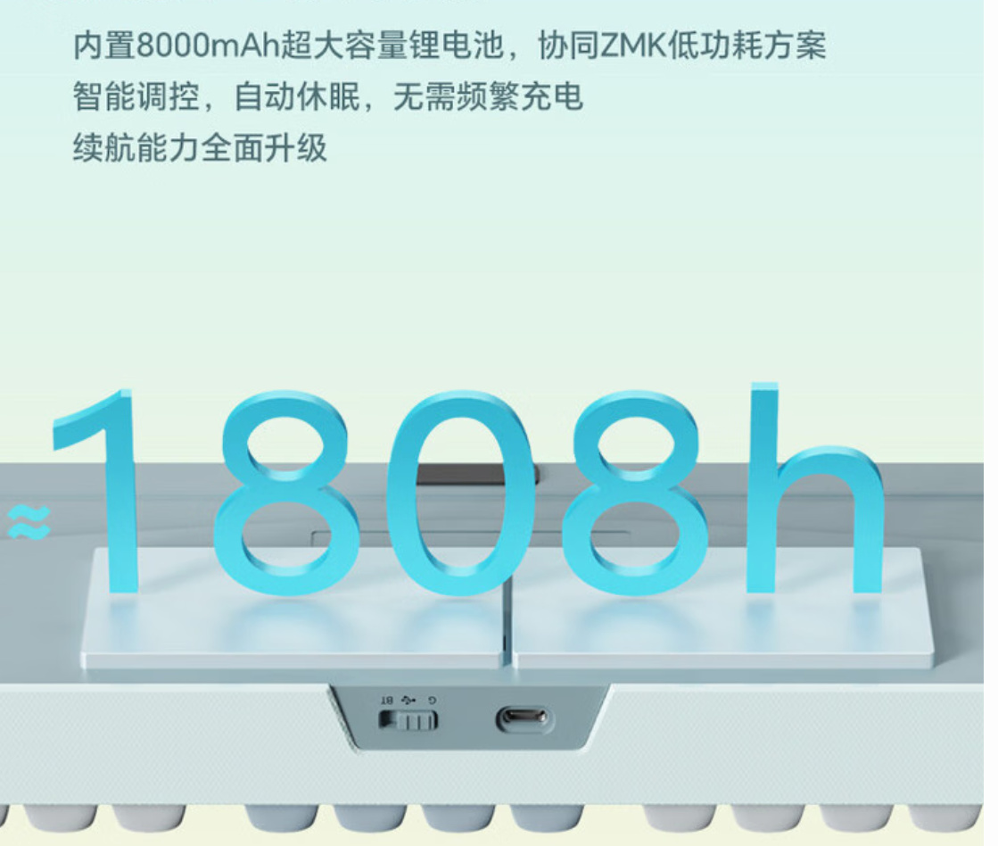 电池:8000mAh + ZMK低功耗芯片,蓝牙关灯续航约1800小时(每天8小时可用226天)