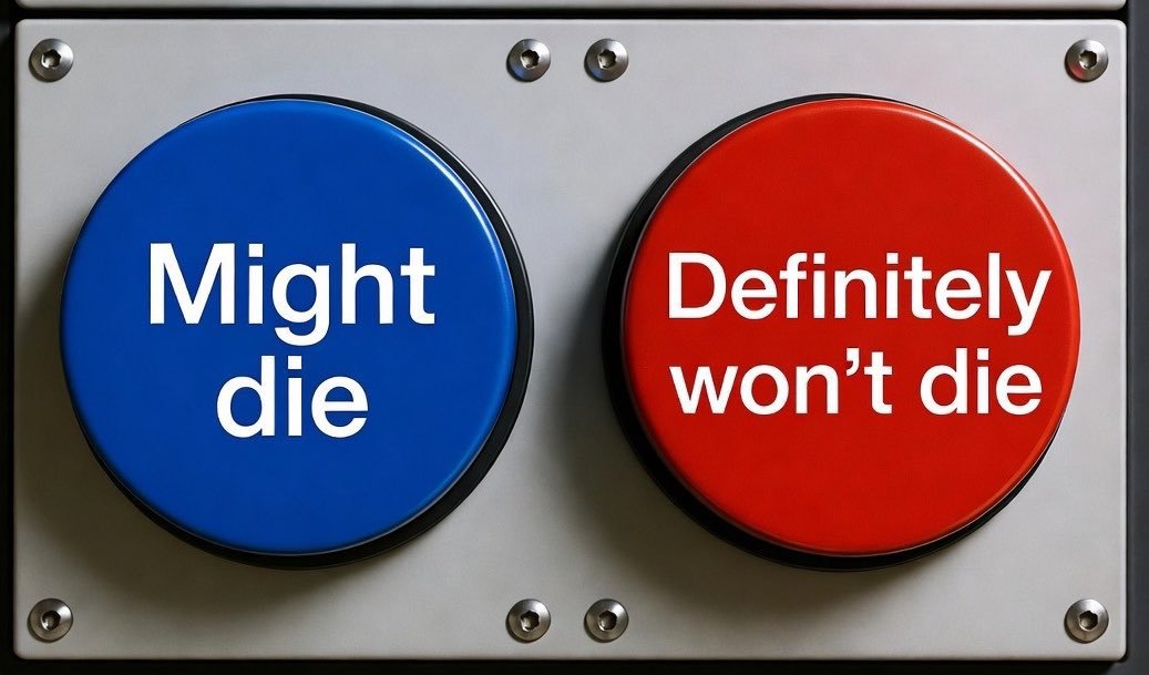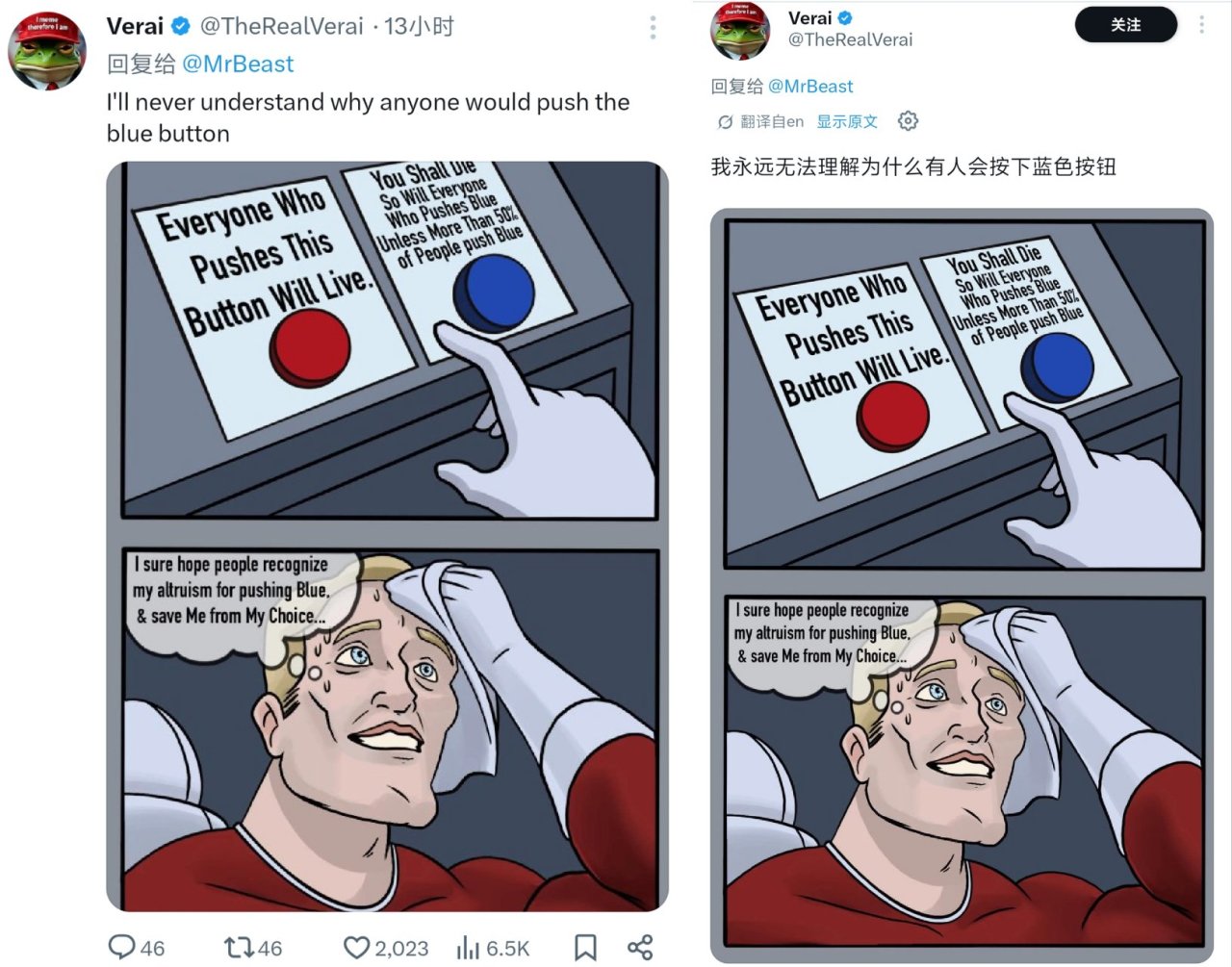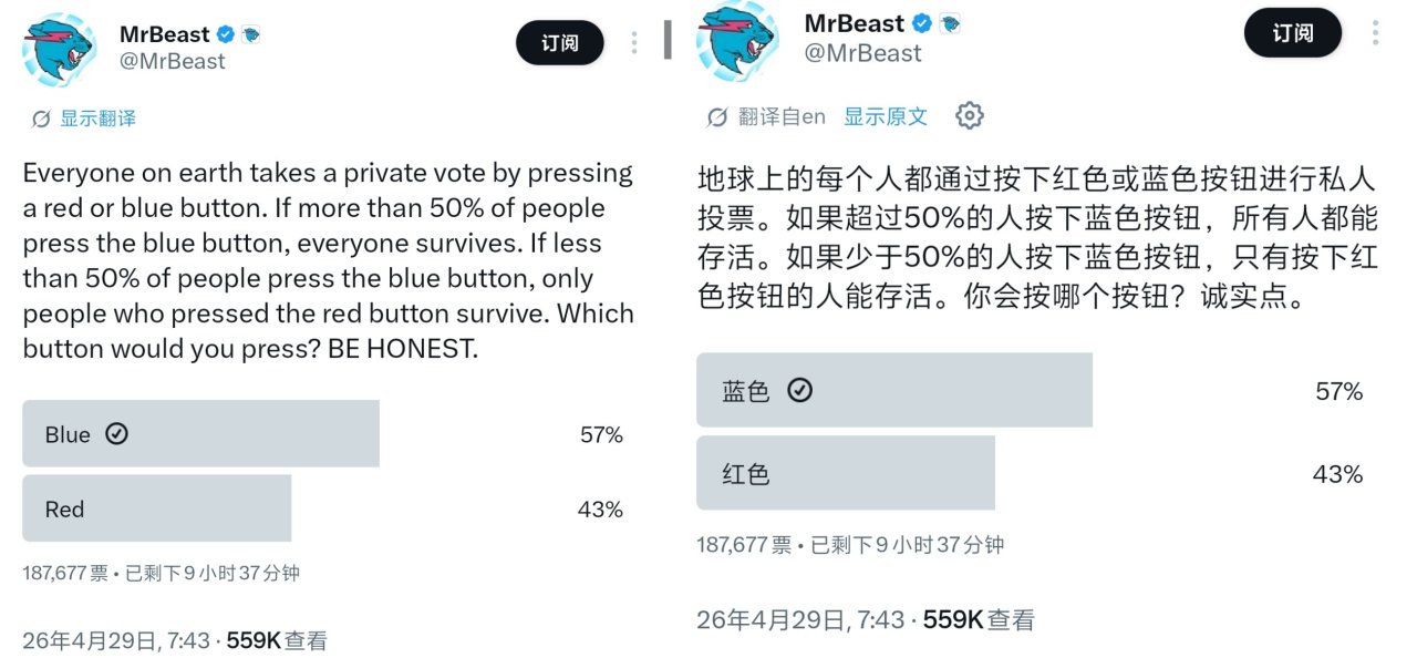 所以说你问题交给你,你是会选择按下蓝色还是红色?