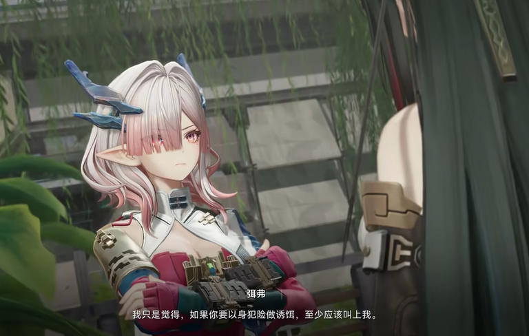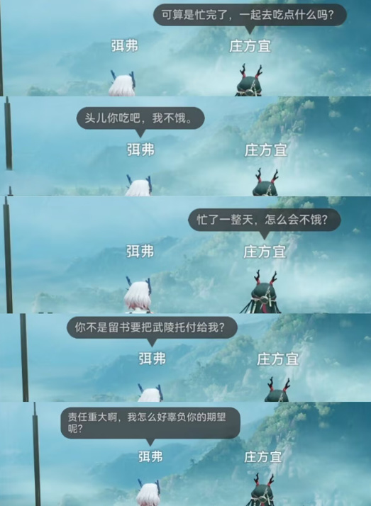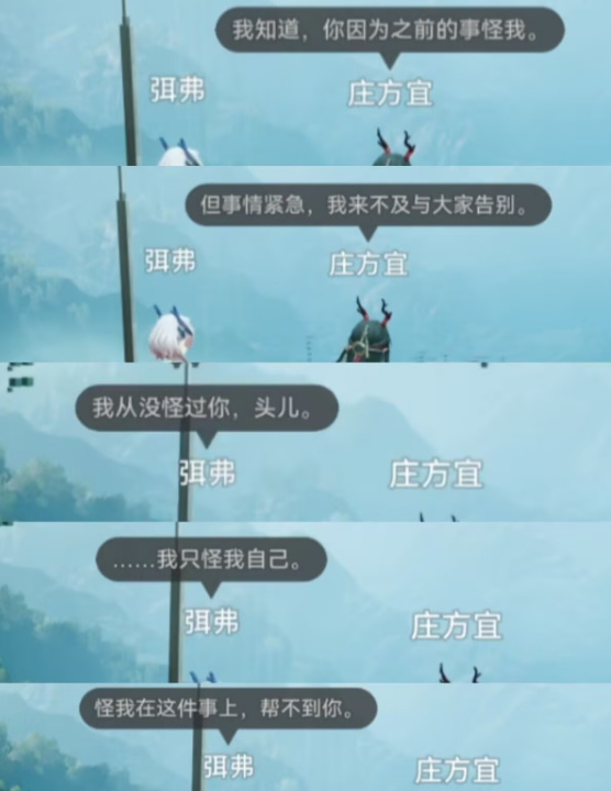 後面小莊因爲性格和傳統炎國高壓鍋什麼事總是要自己扛,揹着大家寫遺書留遺言自己跟裂隙爆了,雖然被咕咕嘎嘎攔住了最後是好結局,可這遺書自然是送到了弭弗手裏,弭弗看完無語了還有第二關,打聶菲斯就自爆還不夠又來一次,兩次還都沒跟她說,於是塵埃落定後我們能看到這樣的場面。
