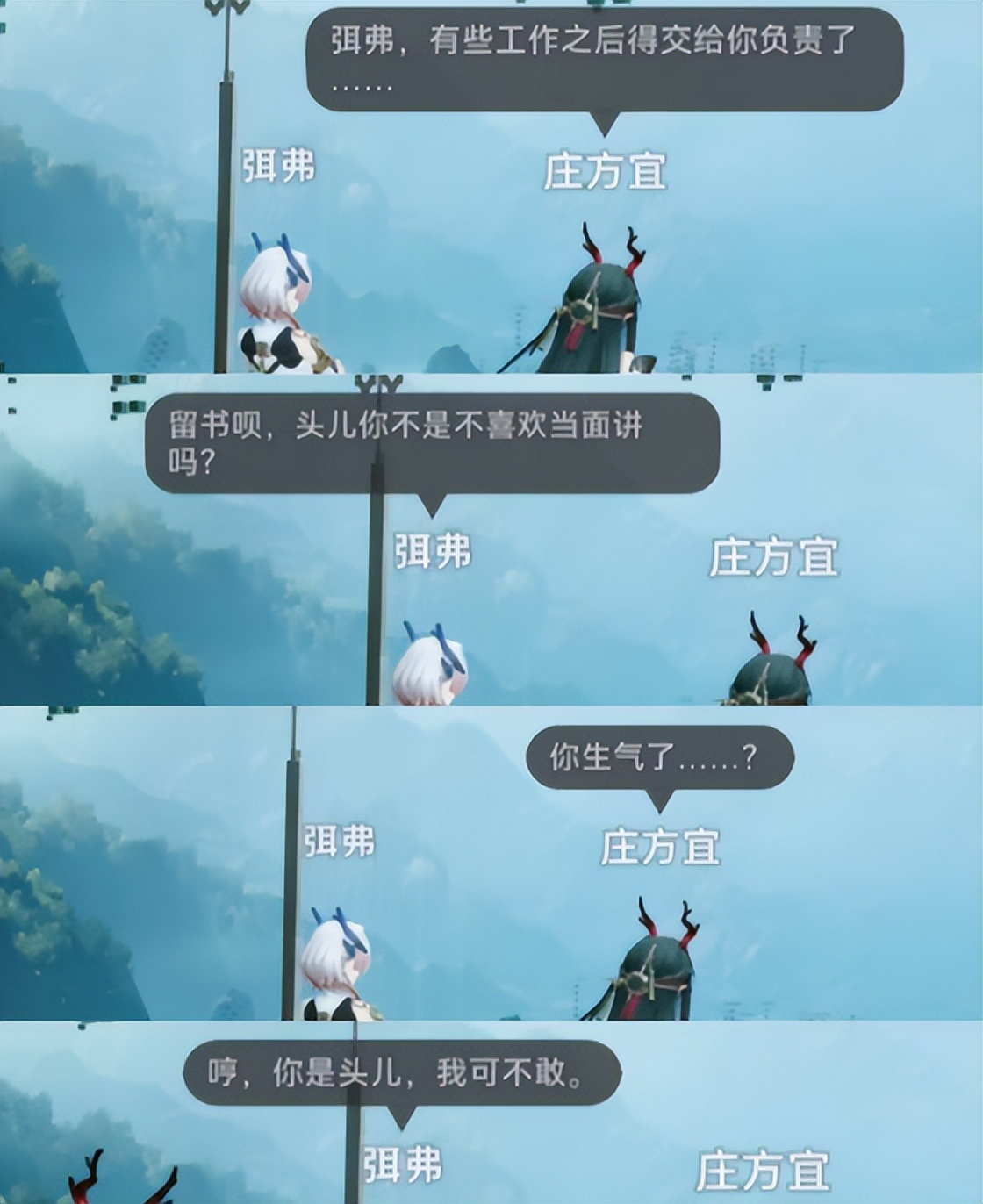 誰家護衛直接懟自己上司的,小莊說給你留了點工作,弭弗表示呦呦呦留書姐怎麼不留書了你不是喜歡留書嗎?什麼生氣,哼,你是頭兒,我哪敢生氣啊,傲嬌記仇這一塊鷹角真是拉滿力!