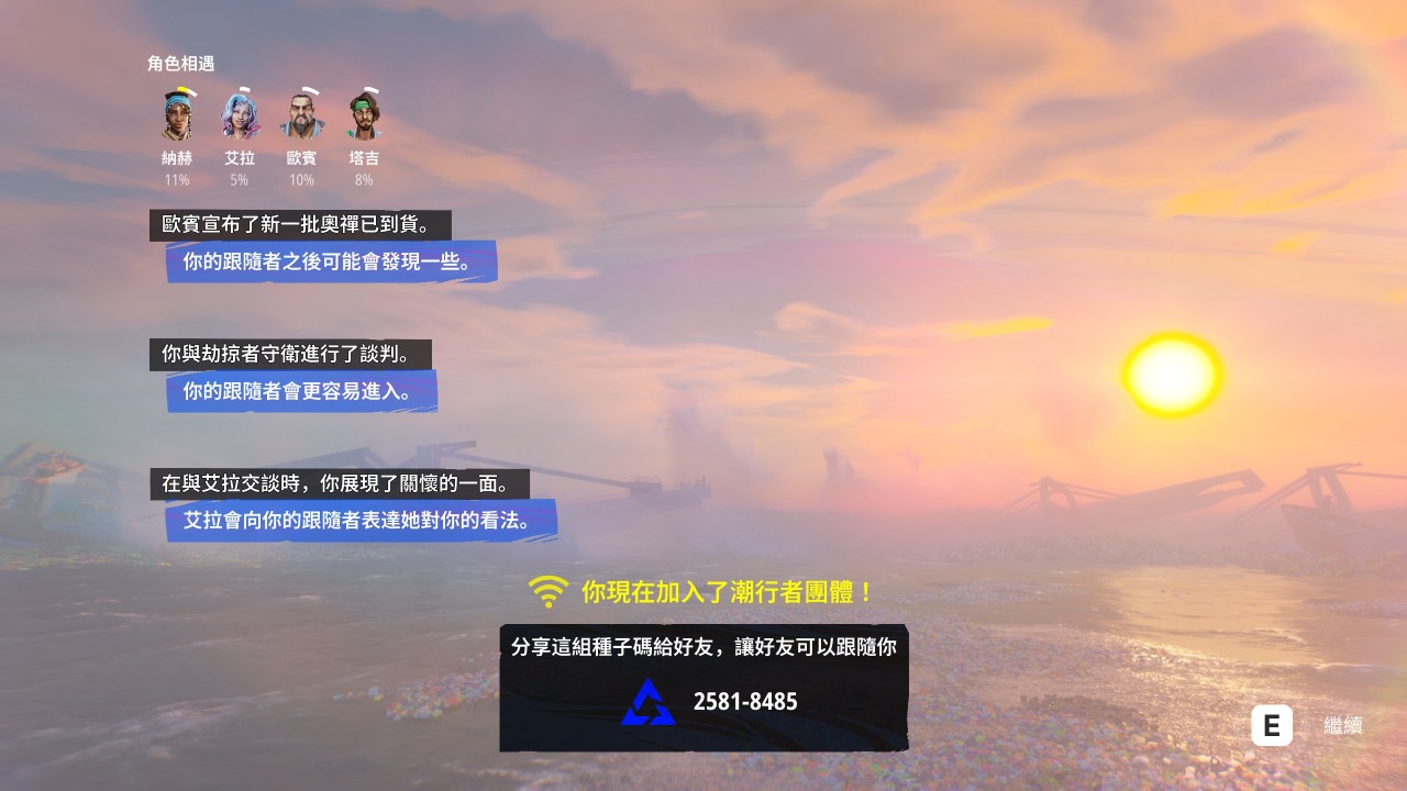 玩家遊玩時可以選擇不同的潮行者進行跟隨,像是世界其他玩家、主播、steam好友等等,所體驗的流程也就不一樣。