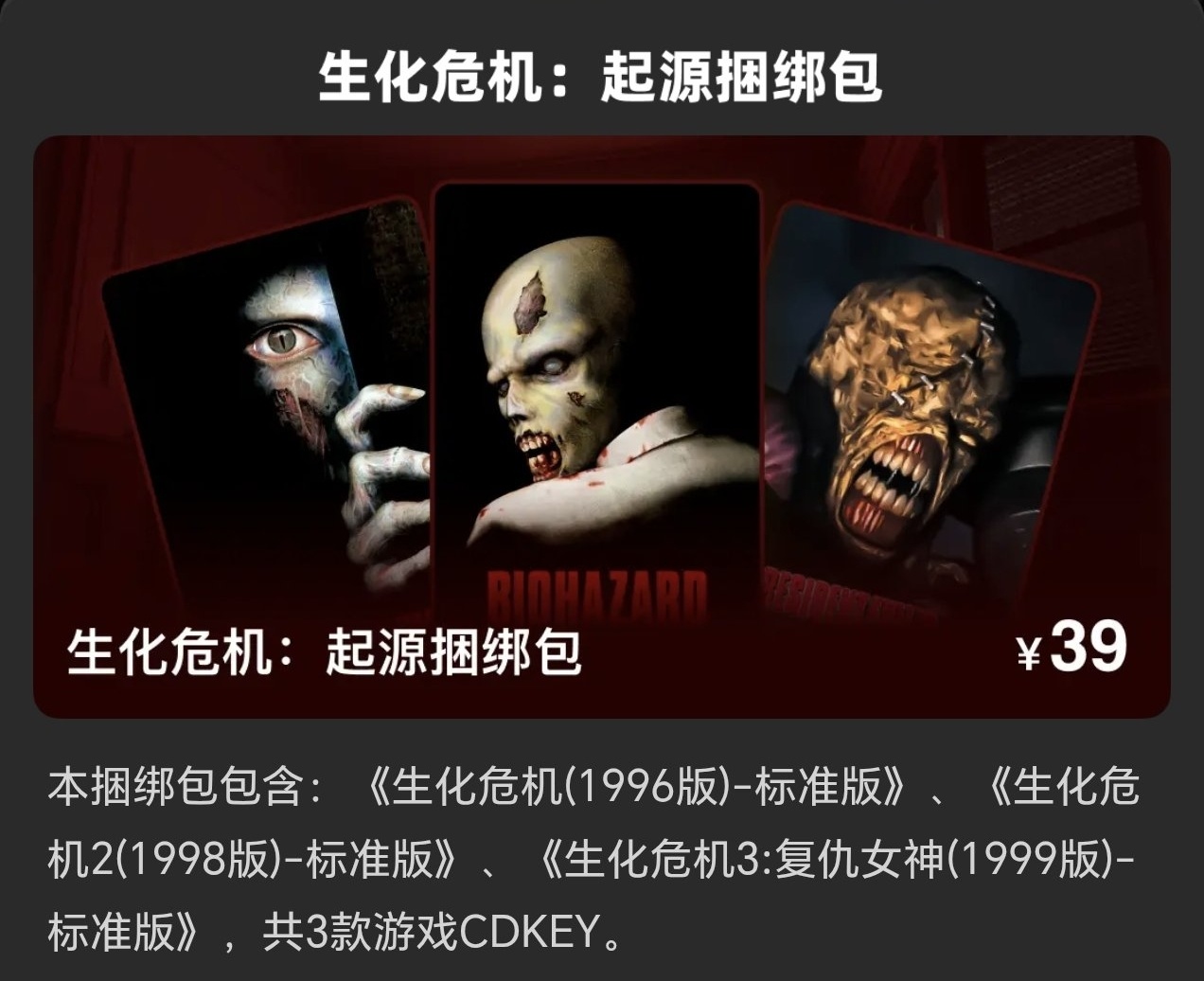 卡普空新上的生化危机老版,3款首发75,结果本次捆绑包3款仅需39,只能说杀疯了!