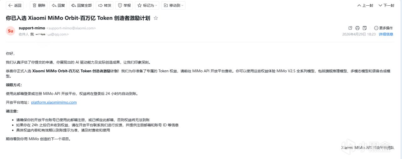 前兩天看到 MiMo 在搞一個 Orbit 計劃,30 天撒 100 萬億 Token,就去申請了一下。