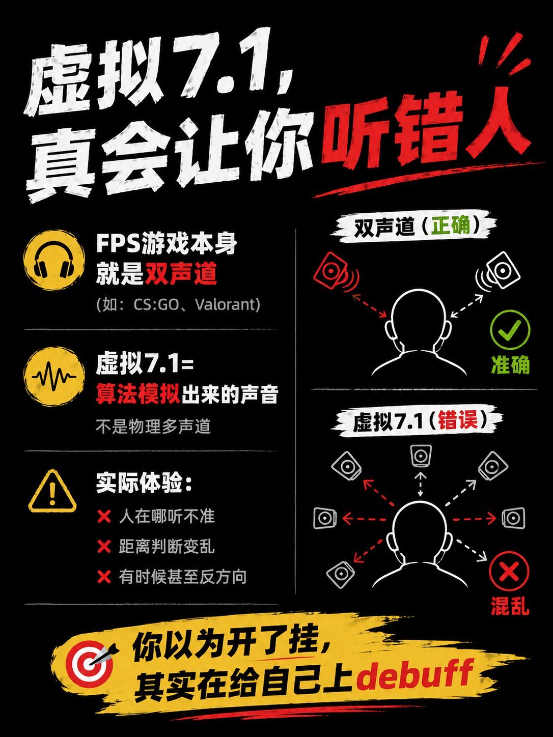 玩CS:GO、Valorant这类FPS,别碰虚拟7.1。这些游戏本身是双声道,算法拆分的音效只会打乱你对敌人方位和距离的判断,反而添乱。