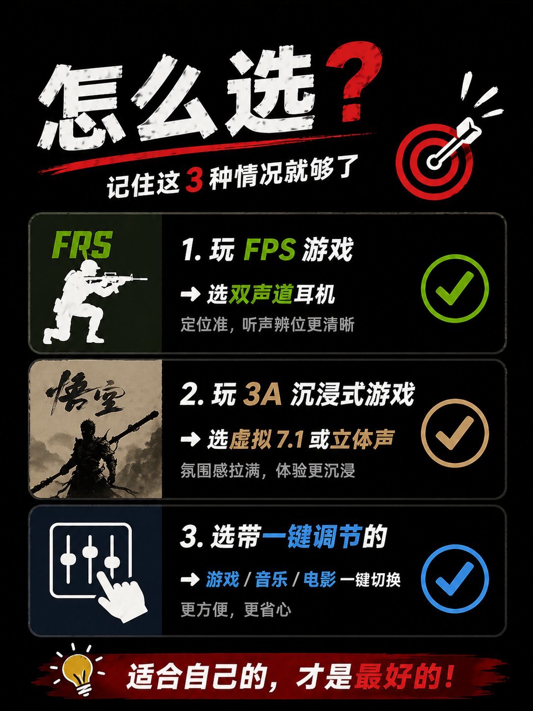 如果既玩3A又玩FPS,优先选支持一键切换的款式,沉浸开7.1,竞技切双声道。至于Hi-Res、无损解码,游戏里用处不大,最终还是选自己喜欢的就行。