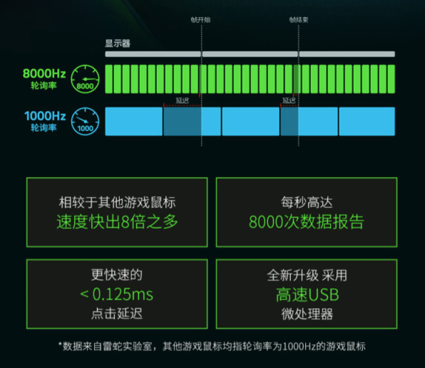 這並不是雷蛇第一次推出8Khz回報率鼠標,早在之前推出的毒蝰8K就刷新了各大媒體的延遲天梯榜。8Khz回報率理論上可以達到0.125ms的超低延遲,比1000Hz回報率的無線鼠標還快八倍。