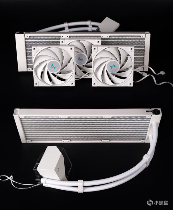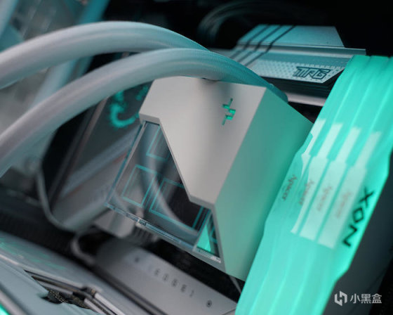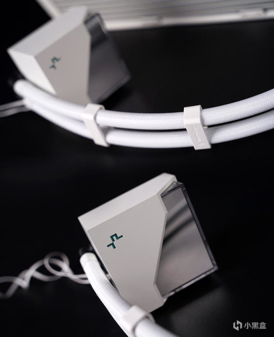 搭配白色散热器,九州风神 DEEPCOOL 冰魔方 360 一体式水冷,冷头造型非常的特别,搭配灯光有着非常不一样的几何视觉美感。
