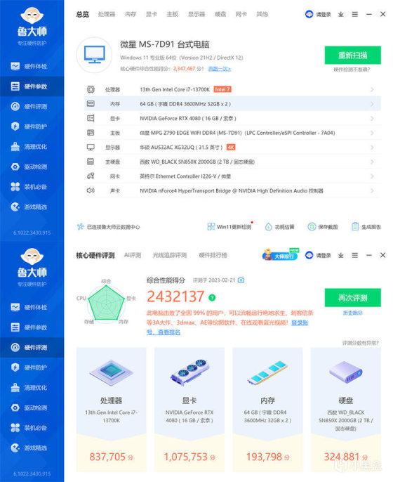 最后测试部分,室内温度 20 度左右,平台仅内存开启 XMP, 其余均为默认,WIN11 的系统,实际测试结果或多或少会有些许出入,仅供参考!首先看看鲁大师,具体的配置信息,给到的综合性能得分为 2432137。