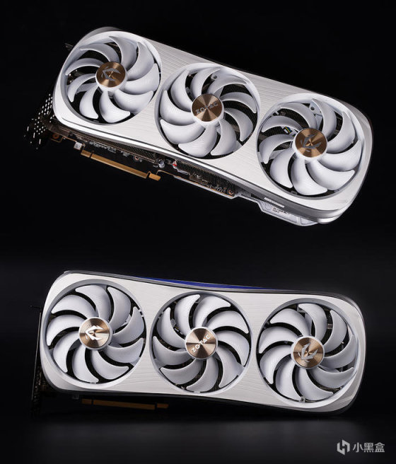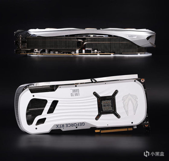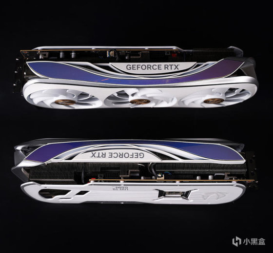官宣采用空气动力学设计,具备有更出色的散热效能,且辨识度也是非常的高!采用 11cm 大号三风扇散热,具备智能启停技术,且居中风扇采用方向旋转设计,可减少空气湍流,降低使用噪音,另值得一提的是风扇罩两侧曲线位置带有 ARGB 灯条修饰。