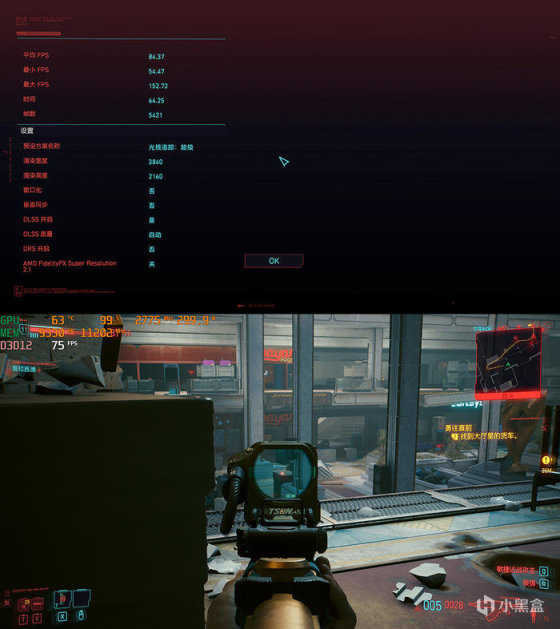 赛博朋克 2077,4K 分辨率,BENCH 测试,超级光追,自动 DLSS ,平均 84.37 FPS ,实际游戏基本符合测试结果。