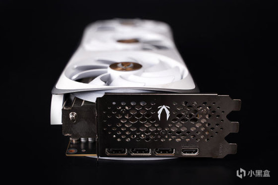 显卡尺寸同样也是非常的大,官标 355×166×72mm,采用 3 PCI 挡板设计,实际整体厚度约为 3.2 个 PCI 卡槽位,表面镀镍处理,点阵散热开孔,对应给到的接口,分别为 3 个 DP 1.4a 接口及 1 个 HDMI 2.1 接口。