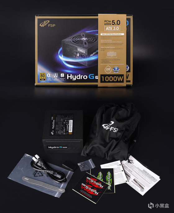 搭配最新的 ATX3.0 标准电源,老牌电源厂商全汉的 Hydro G Pro 1000 金牌全模组电源,外包装采用黑金搭配全汉经典蓝色,金色的腰封上有新版电源的主要特性,包括 PCIe 5.0 供电接口、支持 ATX3.0 电源规范、1000W 额定功率、给到 10 年的质保等信息,里头模组线配有收纳袋、附带红绿两色品牌 LOGO 贴纸、产品说明书、安装螺丝、24PIN 短接插头、电饭锅先、魔术贴。