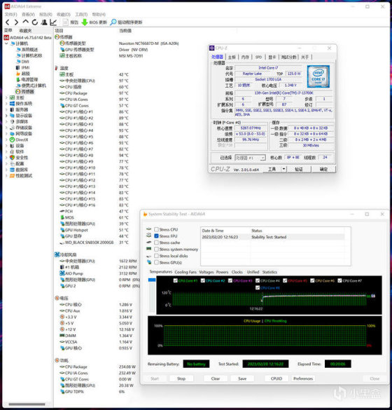 CPU 满载温度表现,AIDA64 单烤 FPU 压力测试,13700K 真男人,20 分钟左右,P-CORE 温度最大值 94°C,E-CORE 温度最大值 83°C,CPU 显示功耗 235W 左右。