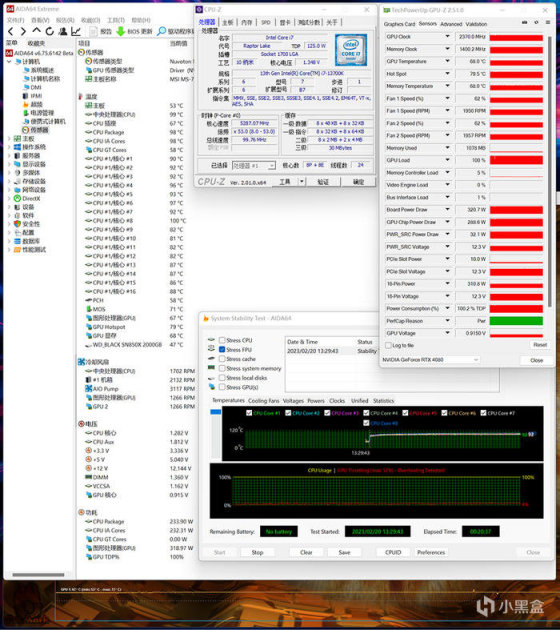 双烤测试,同样也是 20 分钟左右,CPU P-CORE 温度最大值 100°C,E-CORE 温度最大值 88°C,显示功耗 235W 左右,显卡核心温度 68°C(结温 79.5°C),功耗 320W 左右。那么以上就是这台 abee PIXEL ONE 机箱装机秀的全部内容了,如上仅供参考,所述仅代表个人观点,谢谢您的浏览,欢迎大家留言交流!
