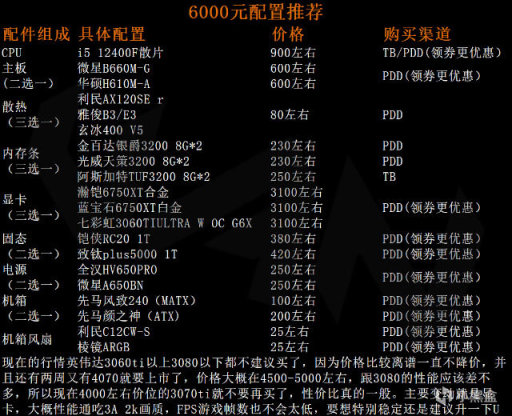 六千上標配甜品基本上就是12400F+3070 6750XT,13400F現在價格有點虛高,差三百,領券會差的少點,刷BIOS上13400F也是可以的。