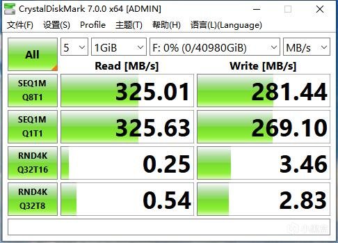 不管是备份,还是个人用户、工作室等直接存储数据,WD My Book Duo的传输速度也是让人惊喜的。在与Windows PC连接之后,RAID 0模式下检测到顺序读取速度高达325.01MB/s,顺序写入速度高达281.44MB/s,不同平台也可能存在一定的速度差异。但这样的表现也可以说相当不错了,应对日常数据备份、创意工作者素材拷贝、直接剪辑处理等等都能游刃有余。