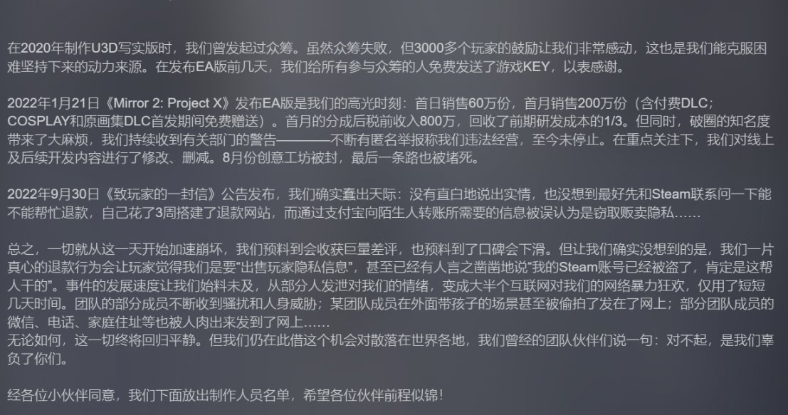 三、《Mirror 2: Project X》製作組宣佈破產解散,開展無條件退款