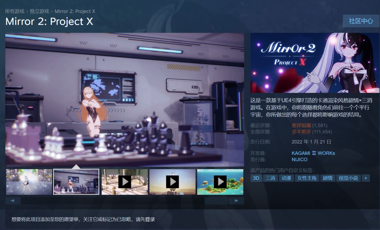 《Mirror 2: Project X》製作組在Steam發佈破產解散公告。《Mirror 2: Project X》在Steam平臺累計收到11.1萬條玩家評論,好評率僅爲“28%”,總評“多半差評”。