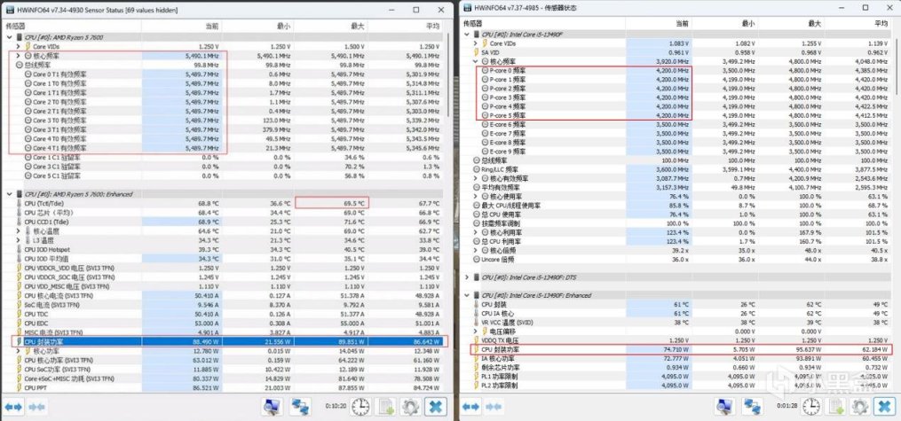 我们使用Cinebench R23对两款处理器进行考机测试。锐龙5 7600在全核5.5 GHz下的满载封装功率也不到90W,而酷睿i5 13490F此时全核频率仅为4.2GHz,但封装功率已经接近95W了,可见5nm Zen4架构的锐龙7000在能效比方面确实是完胜对手。对于玩家来讲,入手锐龙5 7600装机然后直接超到全核5.5 GHz享受一流的游戏性能可以说是性价比非常出色的解决方案了。