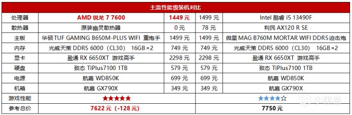 最后,在价格方面,从我们列出的装机配置表就可以看到,附赠了散热器的锐龙5 7600这套主机可以为玩家省下一部分预算,性价比方面也是更佳。更重要的是,AMD已经明确表示AM5平台至少要延续三年,玩家未来升级Zen5也是不需要换主板的,从这方面来看也是选择锐龙5 7600装机更能“战未来”、节约更多的升级预算。