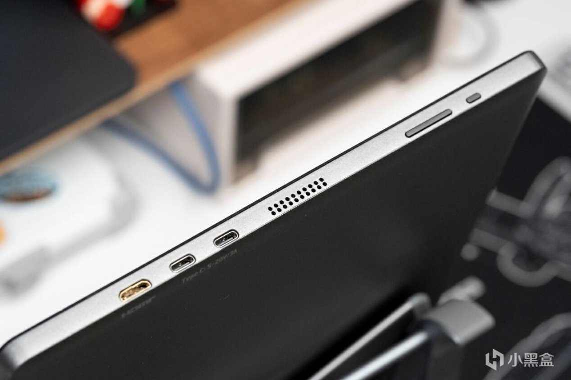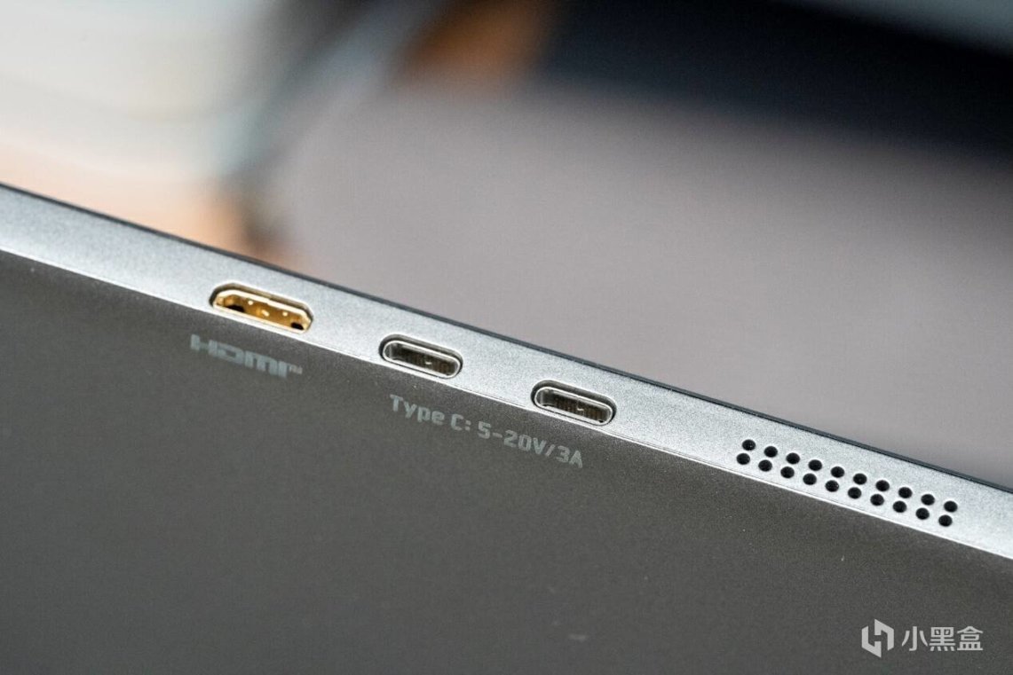 机身上的接口包括一个标准的HDMI接口和两个Type-C接口,都支持视频输入,可以给笔记本、NS等设备做扩展屏幕用。两个Type-C接口都支持5-20V/3A的DP供电。机身边框靠近中间的位置是扬声器开孔,MP161显示器设计了两个扬声器。