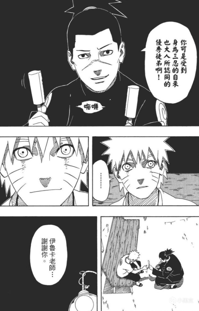比如三年之期的修煉,出發之前鳴人還是在跟伊魯卡一起喫拉麪。伊魯卡也爲出發的鳴人暗暗祝福。