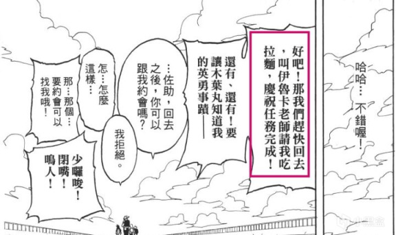 比如波之國篇末尾,鳴人便說回去讓伊魯卡請喫拉麪慶祝任務順利完成。