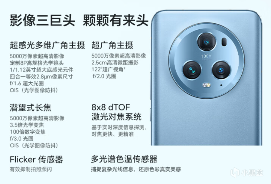 该机后置 54MP 主摄 + 50MP 超广角 + 32MP 潜望(50 倍,光学防抖)三摄,前置 12MP 镜头,支持隔空手势。