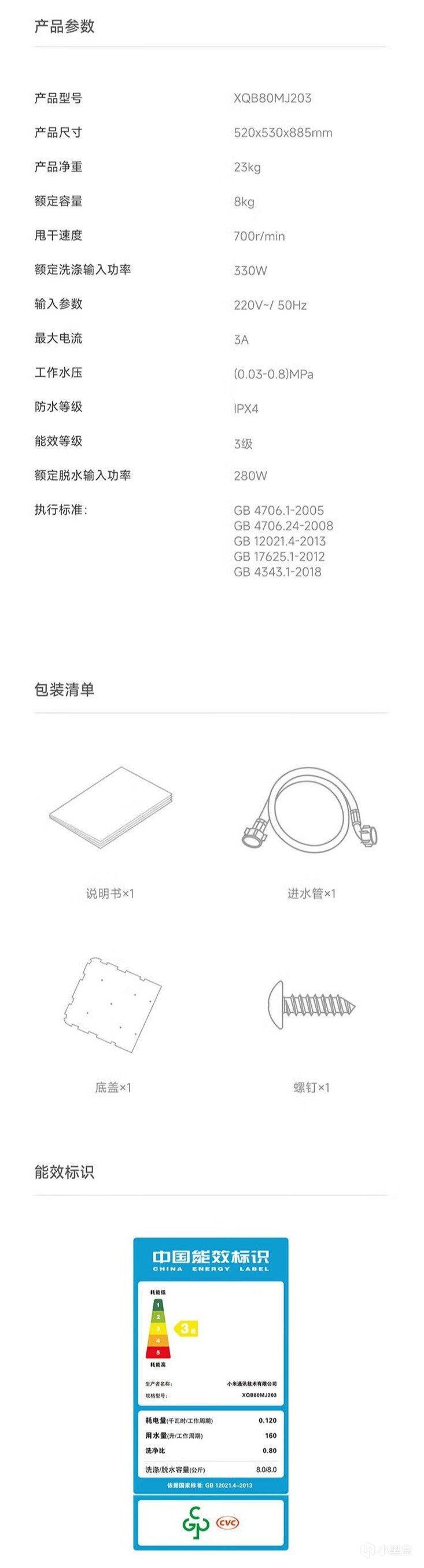 从商品页面的信息来看,这款洗衣机采用三叶旋风波轮,可实现 360 度全方位冲刷,具有 8kg 容量,可洗 36 衬衫、3 幅一米落地窗帘、10 条牛仔裤、3 套床上四件套。