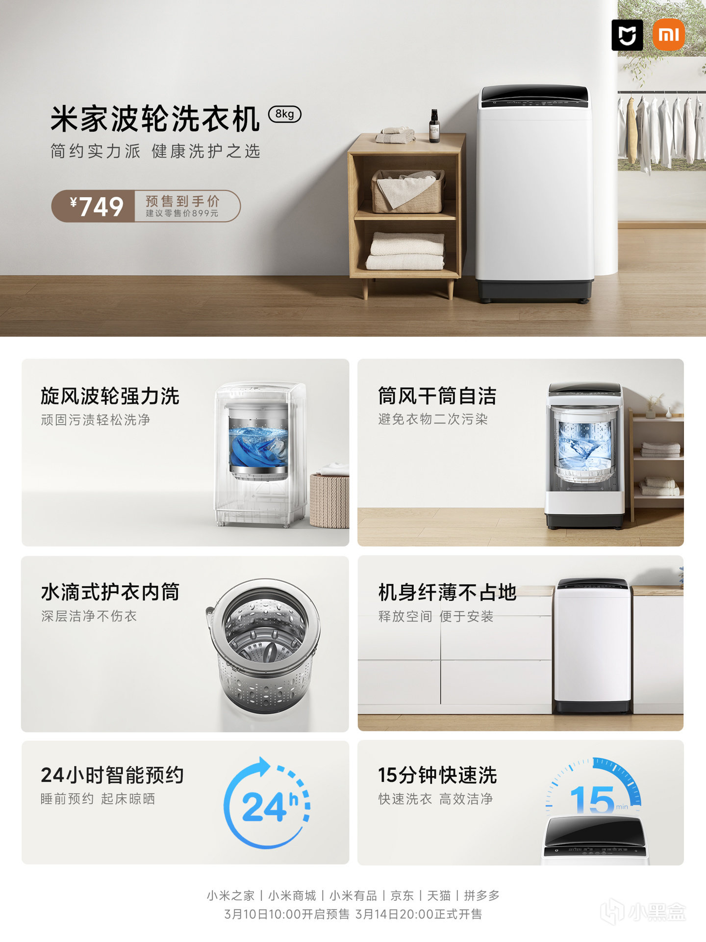 小米官方宣布,米家波轮洗衣机 8kg 今日开启预售,3 月 14 日正式开售,首发价 749 元。