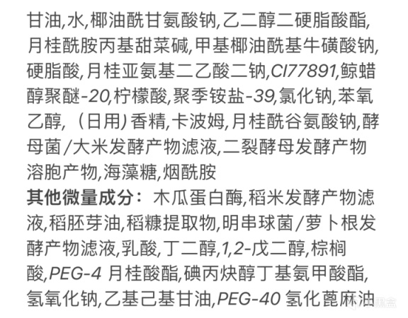 以水为主要溶剂,以甘油为主要的保湿成分。清洁主体采用的是氨基酸表活,椰油酰甘氨酸钠,辅助表活月桂酰胺丙基甜菜碱,以及氨基酸表活甲基椰油酰基牛磺酸钠,清洁体系还算温和。