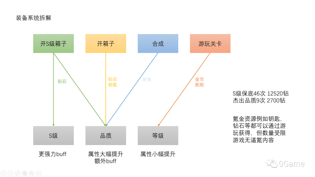 这张aim map标记出了最重要的系统目的为何。譬如装备系统的目的是提高游戏时间与收入,而角色系统的目的是尽可能拉长玩家的游戏时间。综合来看,作为一款单机手游,摒弃了提升玩家之间交流联机的需求后,对于提升游戏收入和拉长游戏时间都拥有自己的方式,且效果尚佳。
