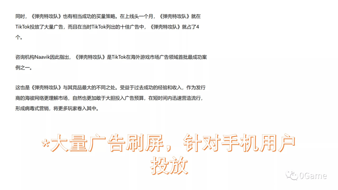 前文中提到,弹壳特攻队主要玩家群体是拥有碎片化时间的手游玩家,这一点也体现在了广告投放的平台上。相信曾经一段时间内,我们的手机都曾经被弹壳特攻队的广告刷屏,而且总是出现在意料之外的地方——抖音上,微信朋友圈里,甚至是许多小游戏的复活广告全部被弹壳特攻队的广告暴力占领,藉此优势和正确的游戏群体广告投放,被吸引的人自然不在少数。而对于一些电脑玩家,广告中一眼就能看出和吸血鬼幸存者的相似元素,有需求游玩的玩家自然也会下载