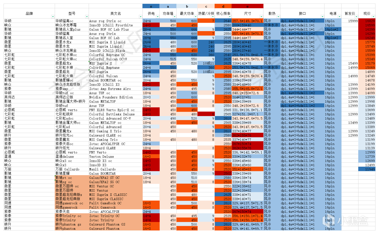 最后,用一张图总结一下,图中颜色从蓝到红,分别代表s、a、b、c、d和e,显卡名标橙色的为未在国内发售的显卡。