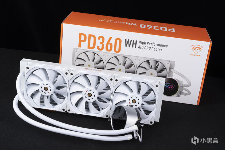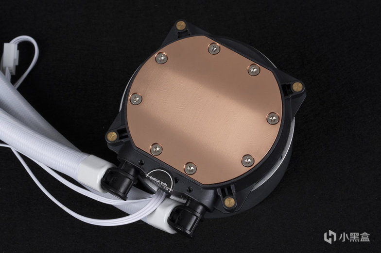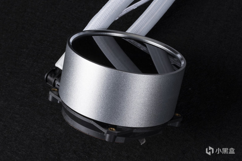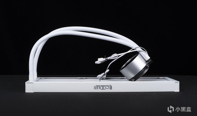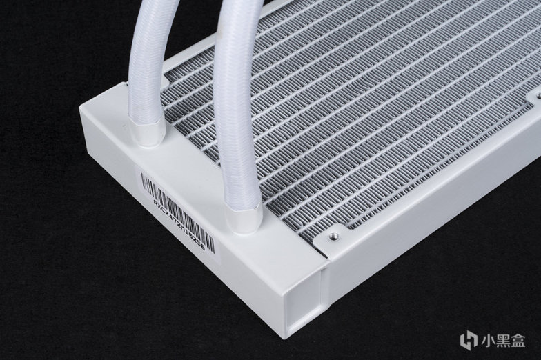 水冷本体采用标准27mm厚冷排,散热鳍片分布规整密集,整体白色哑光喷涂工艺,两侧中间镶嵌亮面的超频三LOGO,采用了高耐压水冷管,外部采用白色织物包裹,水管的连接部分有做加固,增强密封性。