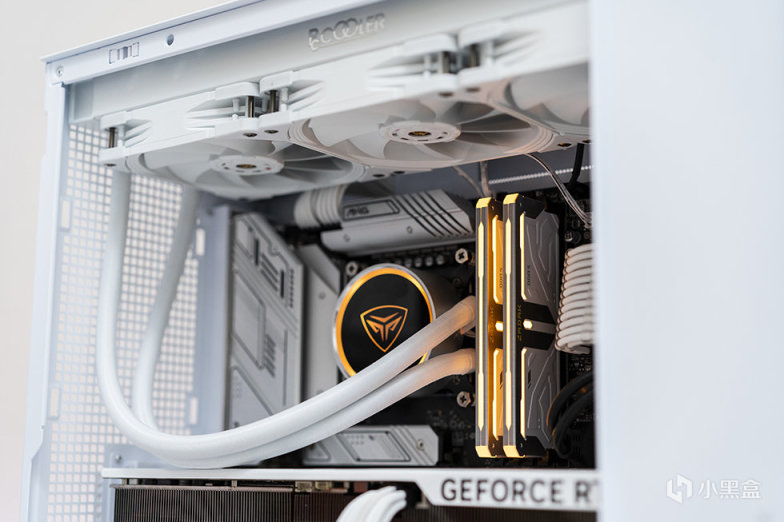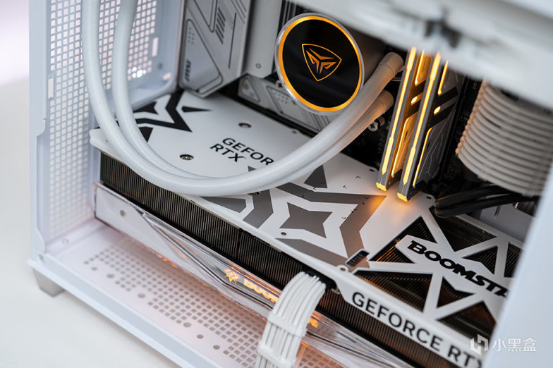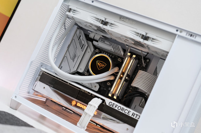 内部的灯效统一调整为橙色(R:255,G:60,B:0),透过MESH侧板可以看到冷头、内存、显卡的透出的灯光,若隐若现。