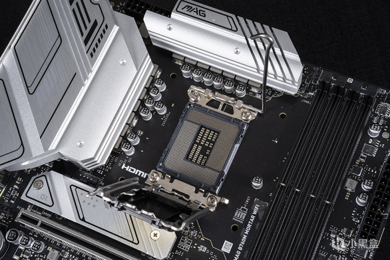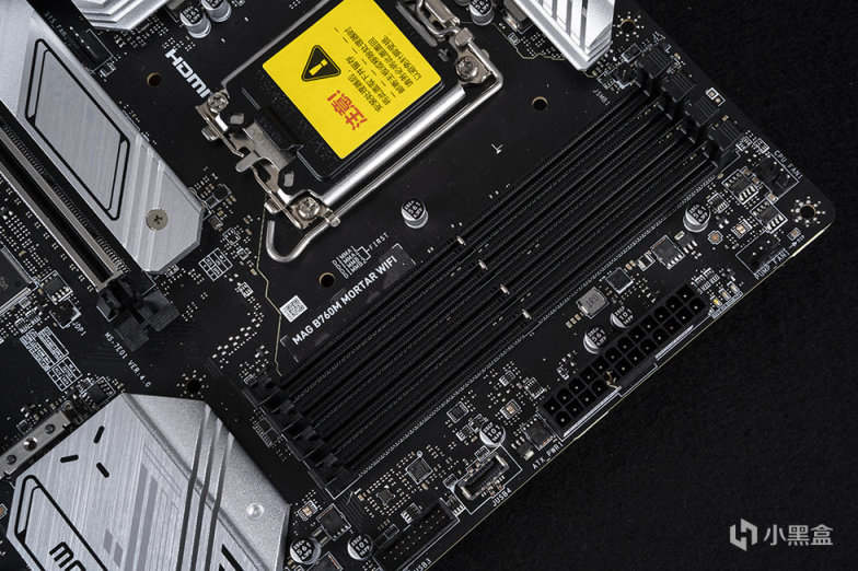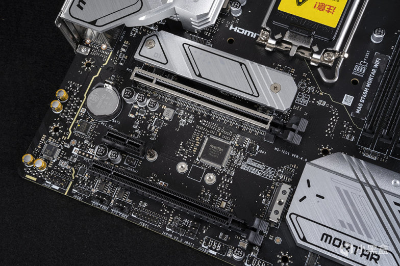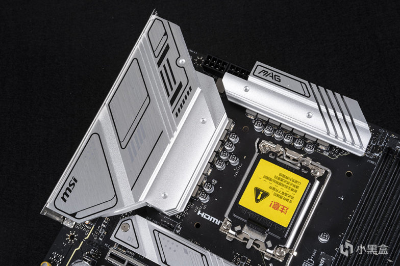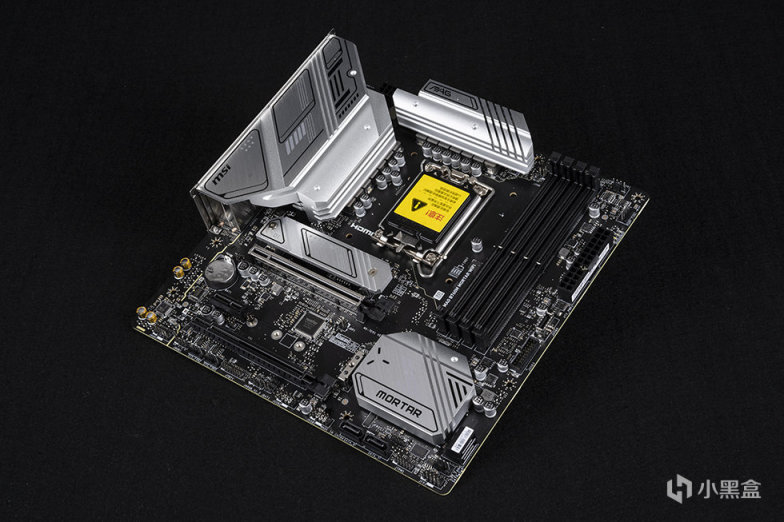 主板选用了微星 MAG B760M MORTAR WIFI,标准的MATX紧凑版型,基于Intel B760芯片组,采用6层2oz加厚铜PCB,主板的VRM(CPU供电区域),第一个SSD安装位,南桥芯片位置均覆盖了厚重的银白色铝制散热装甲,和底部黑色的PCB形成银黑配色。