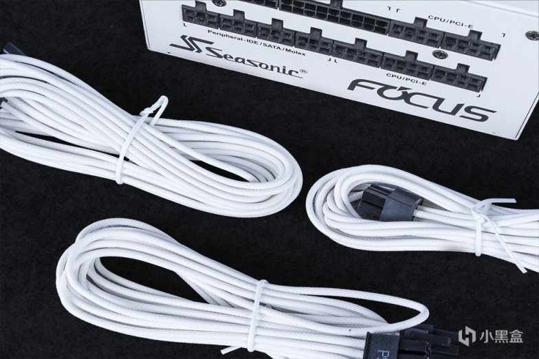 模组线一共有11条,分别为1条24pin主供电,2条4+4pin CPU供电、3条6+2pin PCI-E供电、1条D型4pin以及2条SATA接口。均为白色压纹线,规格采用足料铜芯的16AWG线径以及耐高电流镀金端子,省去了定制模组线的额外开支。